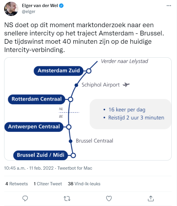 Blijkbaar doet NS momenteel marktonderzoek naar een snellere IC tussen Amsterdam (Zuid) en Brussel.