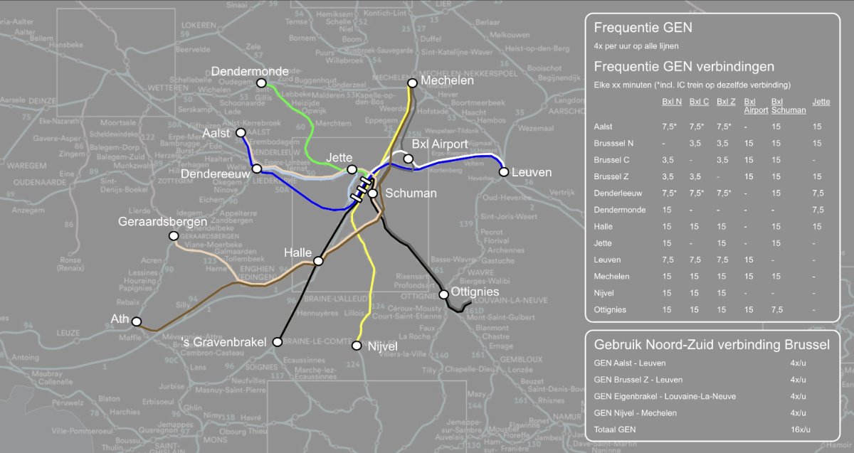 Andere verbindingen zijn mogelijk met een korte overstap in knooppunten aan de rand van het GEN netwerk (Mechelen, Leuven, Ottignies, Halle, Denderleeuw)