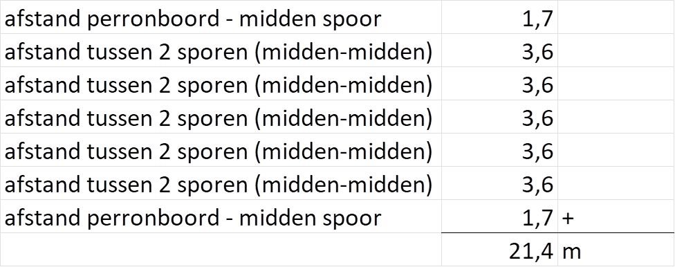 Ik meet in google ca. 23 m tussen de perronboorden: