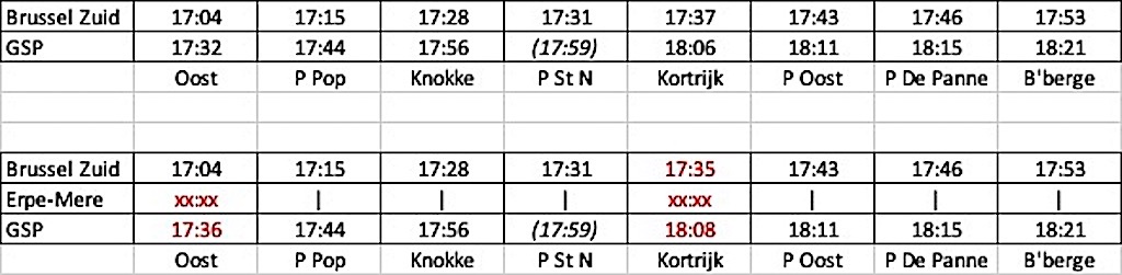 Er zijn tot 8 snelle treinen per uur langs L50A, vertrekkende uit Brussel-Zuid tussen 17:00 en 18:00: 7 non-stop naar Gent-Sint-Pieters (IC538, P8009, IC2838, IC438, P8002, P8007, IC1539) en een 8ste die meteen de bocht maakt naar Gent-Dampoort en Sint-Niklaas (P8013). Laten we de meest succesvolle verbinding vooral zijn huidige betrouwbaarheid behouden.