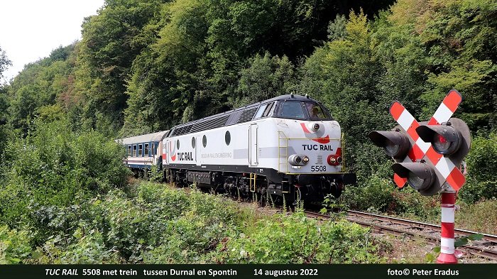 Ook TUC RAIL 5508 doet dienst bij de Chemin de Fer du Bocq alwaar we de loc zien tussen Durnal en Spontin, met een trein naar Ciney.