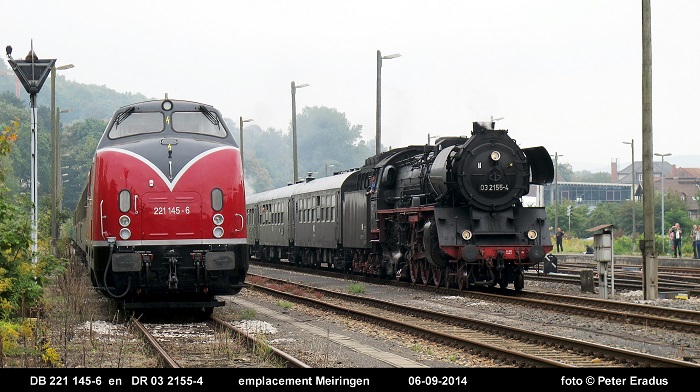 De V221 heeft haar trein na uitstappen reizigers op het emplacement geplaatst, terwijl de 03 met extra trein aankomt met de volgende groepen bezoekers van de Dampfloktagen.