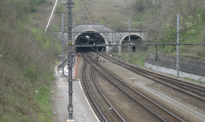 Correct, Yves, het is de uitrit van Hoei richting Statte. Met rechts de mond van de oude tunnel, die al sinds 1904 wegens noodzakelijke verstevigingswerken op enkelspoor geëxploiteerd moest worden en dus een serieuze flessenhals vormde. Werd in de jaren 1967-70 vervangen door de nieuwe, dubbelsporige tunnel links, waarna de lijn in 1970 geëlektrificeerd werd.