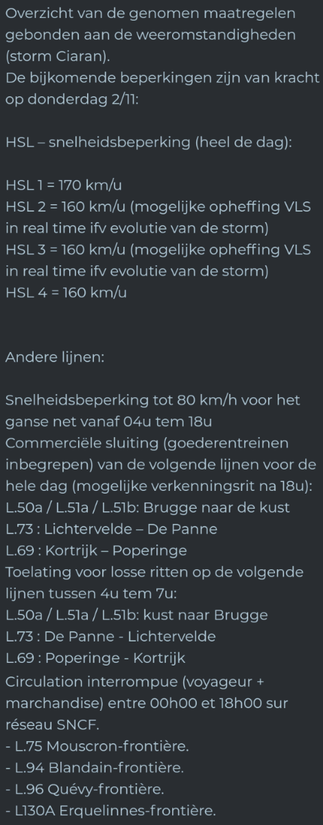 De meeste obstakels had men best kunnen vermijden als Infrabel de gelegenheid en de toestemming zou krijgen om bomen langs de sporen te verwijderen en eigenaars van belendende percelen te verplichten om alle bomen te vellen die hoog genoeg zijn om op de bovenleiding of de sporen terecht te komen. Maar ja, dan staan de actiecomités weer direct op hun achterste poten.DR-fan schreef: ↑02 nov 2023, 14:28 Mijn eerste reactie was ook dat men overdreef, maar gezien de ontwikkeling van de laatste uren geef ik mijn ongelijk toe. Op letterlijk tientallen plaatsen zijn er problemen met obstakels die in het spoor en/of de bovenleiding waaien: L50 (2 plaatsen), L89 (2 plaatsen), L15, L86, L54, L140, L96, L21, L21A, ... Dus ook ver in het binnenland waar volgens sommigen niets aan de hand is.