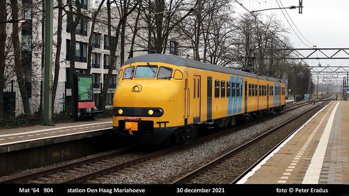 Kwam gisteren in de stromende regen nog Mat '64 treinstel 466 voorbij, vandaag kwam onder betere weersomstandigheden en maar een paar minuutjes te laat de 904 voorbij op weg van Den Helder, via Haarlem naar Den Haag Centraal. Met opvallend, op de zijkanten de opschriften van de nieuwe eigenaar van dit treinstel.