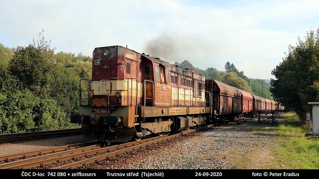 Kort daarop was het de Tsjechische Diesellok serie 742 welke met veel gepruttel met een enorme sleep zelflossers voorbij kwam. Overigens opvallend hoe mooi schoon die zelflossers altijd zijn. Een rijdende graffitiemuur komt in Tsjechië gelukkig niet voor terwijl je juist daar overal kan en mag over de sporen lopen.