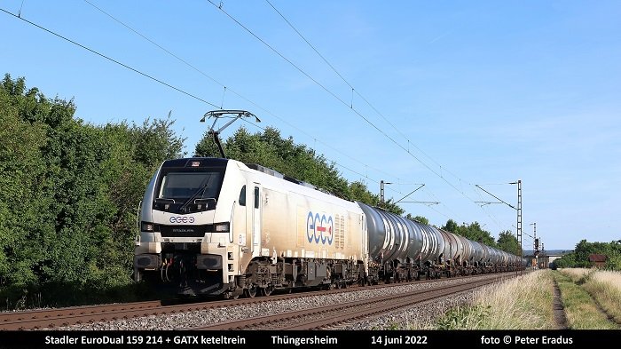 Op deze zonnige dinsdagavond passeert de fraaie 6-assige Stadler EuroDual van Ecco Rail uit Katowice (Polen) mij op de bekende fotolocatie te Thüngersheim. Ondanks dat de loc pas sinds begin 2022 in dienst is, is het nieuwe er helaas, door de wel erg besmettelijke kleur, er al een beetje vanaf.