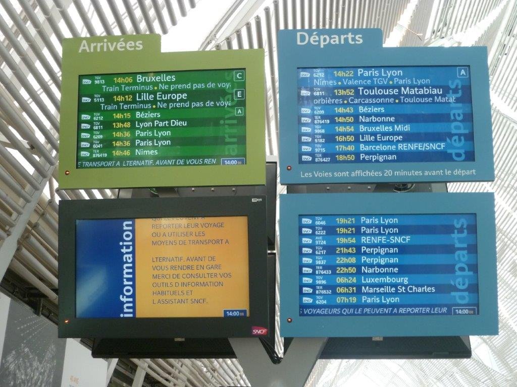 Voorbeeldje van hoe ze in het Frankrijk aanpakken: de vertrekschermen in het blauw, het aankomstscherm in het groen en het informatiescherm in het zwart. Allemaal mooi gegroepeerd en tegelijk duidelijk afgebakend.