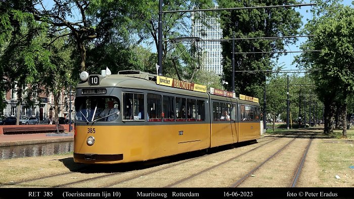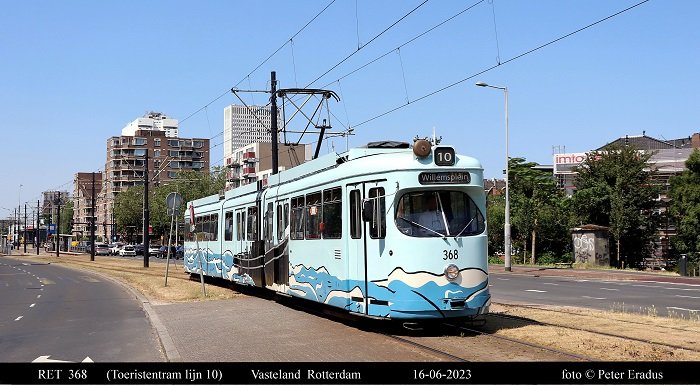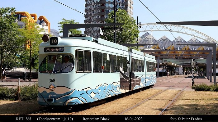 Door logistieke problemen reden op de Rotterdamse Lijn 10 op 15 en 16 juni 2023 niet de overbekende Allan vierassers maar twee Düwag trams uit de '60 jaren.