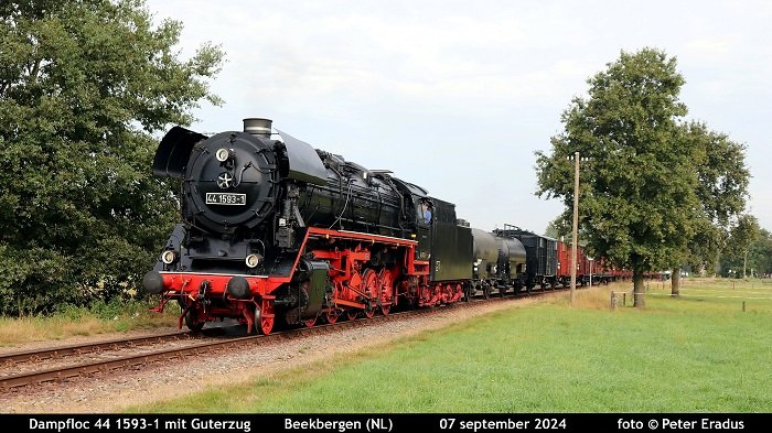 VSM Stoomloc 44 1593-1 komt met goederentrein aan te Beekbergen. De 44 1593-1 is in 1943 in Frankrijk gebouwd.