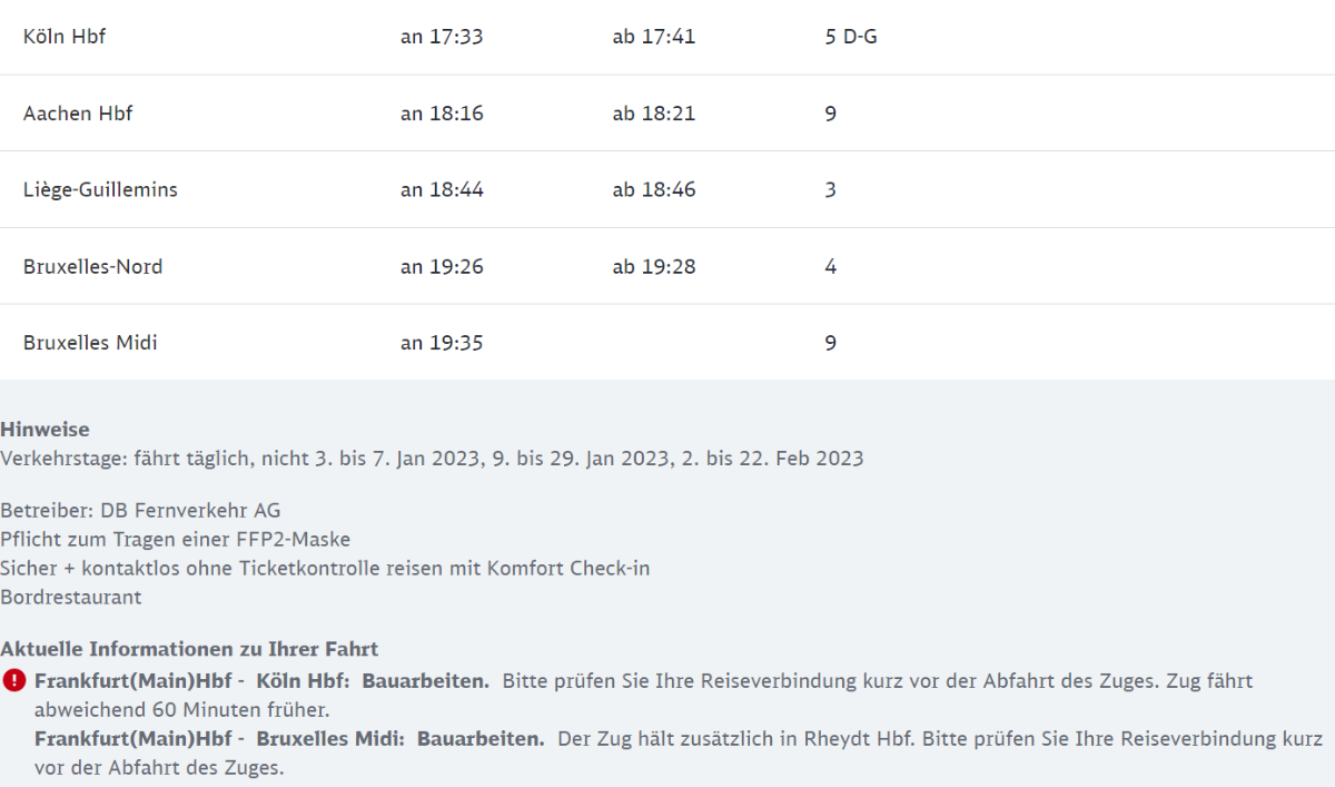 Die trein zal idd een uur vroeger vertrekken in Keulen, daar mag je met bijna 100% zekerheid vanuit gaan. Wanneer de effectieve dienstregeling in de planner verschijnt bij werken/omleidingen, is zeer variabel. Soms maanden, soms dagen op voorhand.ovspotter_be schreef: ↑18 dec 2022, 19:25 Weet iemand hoe lang op voorhand Deutsche Bahn hun dienstregeling aanpast bij werkzaamheden?