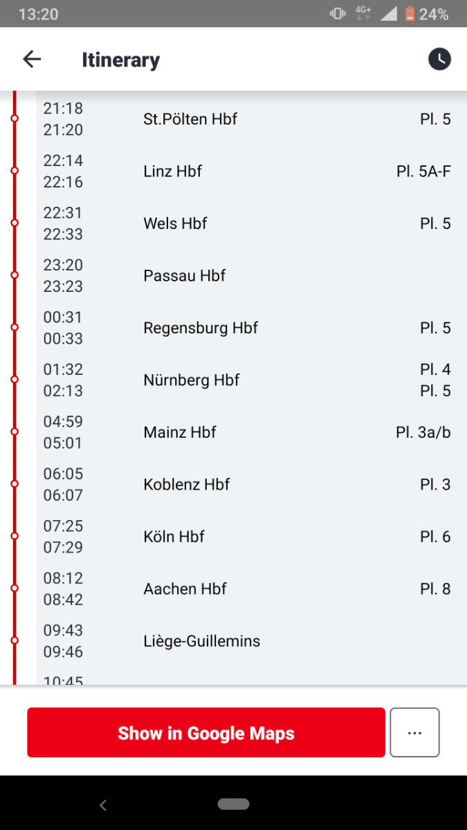 Zoals ik al gezegd had waren er grens/Passpoort controle op de trein. Hierdoor is de nodige tijd om in Nürnberg de treindelen te wijzigen in gedrang gekomen. Maar niet te min. We zijn Aachen hbf uitgereden met +34min RT. Aankomst in Brussel-Zuid was wonderbaarlijke -1min. De dienstregeling in België is wel heel ruim genomen. In Luik moest de E532 wel wachten om voorrang te verlenen aan de nightjet E324.