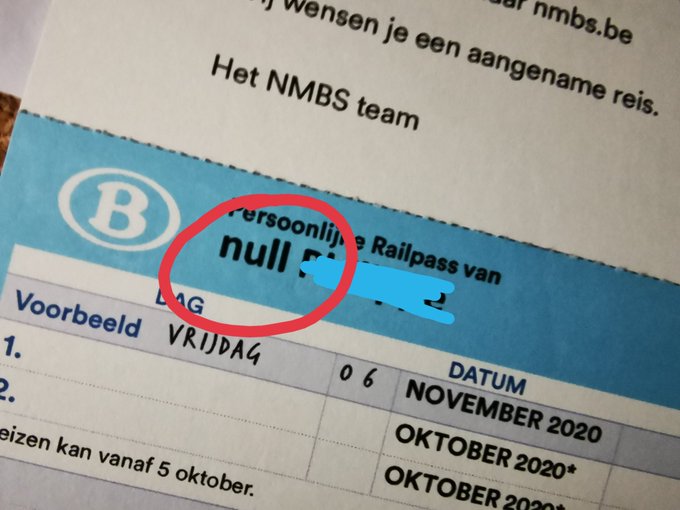 Door een 'bug' bij de verwerking hebben sommige mensen een pas ontvangen waar hun voornaam is vervangen door null :D