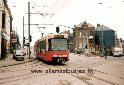 Vervolgens zien we dezelfde kruising , maar dan van de andere zijde: de boog van lijn 31 naar lijn 90 is weg, en aan de zwaar vervuilde tram te zien loopt ook deze lijn op zijn einde. Dan nog een foto van lijn 90 met BN'er (in Nederland heeft dat een heel andere betekenis!) onderweg naar Charleroi. Wat veelvuldig voorkwam bij dit soort kruisingen is de gewoonte van de NMVB om afslaande bewegingen standaard op "verkeerd spoor" te laten verlopen: lijn 89 moest naar Monument in de Rue Paul Janson eerst doorwisselen naar linkerspoor, dan linksaf slaan , om vervolgens op de wisselplaats op de Rue de Mons weer rechts te komen.. Lekker tegen het verkeer in, zelfs tegen het tramverkeer! Overigens is in 1999 het spoor tussen Jonction en Monument geheel vernieuwd , waarbij toen pas de laatste resten van de kruising zijn opgeruimd. Op een Youtube video uit 1994 http://youtu.be/R1nJRX8uqJ0?t=4m50s is nog zeer duidelijk te zien dat de sporen naar Morlanwelz van lijn 30/31 op de kruising zelf zijn onder geasfalteerd, maar verder is alles er nog.
