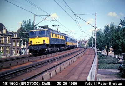 Een opname uit de nadagen van de NS serie 1500. Op de dag voor haar buitendienststelling (30-05-1986) rijdt de 1502 nog met de intercity van Den Haag CS naar Venlo over het spoorviaduct in Delft alsof er niets aan de hand is.
