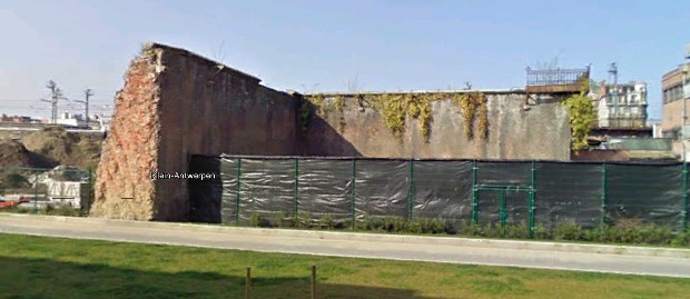 In een link op de site die de topic starter vermeldde vond ik nog een bewerkte schuine luchtfoto, die mooi de nu "ontgraven" steunmuren toont rechts van de gebouwen aan de Van Spangenstraat en ook de achterkant toont van de zgn. "centers" (Sinjorenwoord voor de met een schuine wand dichtgemetselde gewelven) langs de Stoomstraat(!) die aan die fotobewerking ontsnapt zijn:Die steunmuren zijn op de laatste Streetview opnamen ook nog steeds te zien, dus misschien laten ze er iets van staan. Hier de straatzijde van de "centers" langs de Stoomstraat. Opgemerkt mag worden dat de projectontwikkelaar met de bewerkte luchtfoto letterlijk een nieuw licht op de zaak werpt: de schaduwen van de twee nieuwe gebouwen wijzen merkwaardigerwijs niet mooi in dezelfde richting als op de rest van de foto!