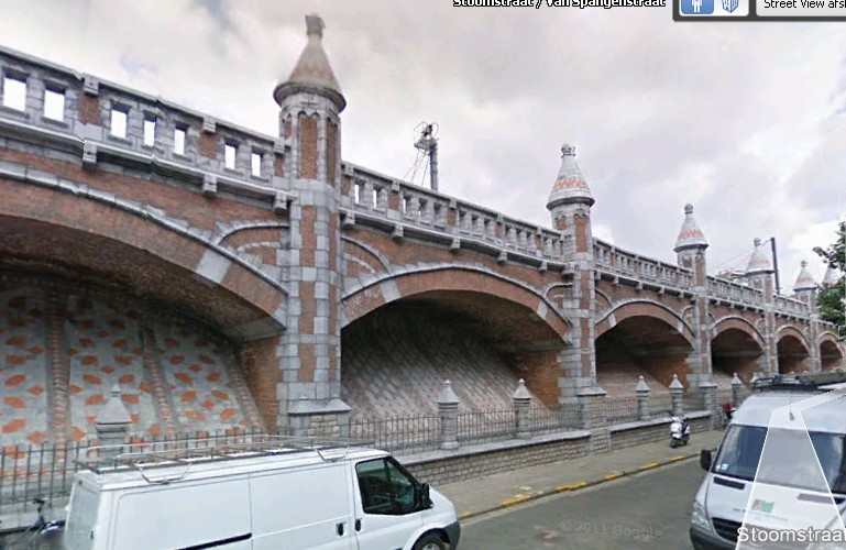 In een link op de site die de topic starter vermeldde vond ik nog een bewerkte schuine luchtfoto, die mooi de nu "ontgraven" steunmuren toont rechts van de gebouwen aan de Van Spangenstraat en ook de achterkant toont van de zgn. "centers" (Sinjorenwoord voor de met een schuine wand dichtgemetselde gewelven) langs de Stoomstraat(!) die aan die fotobewerking ontsnapt zijn: