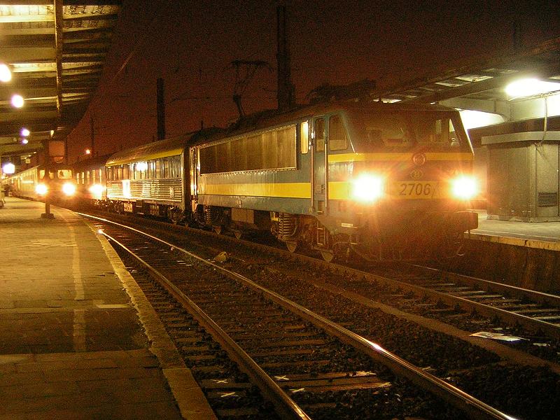 Rond half 6 werd ik wakker geschud en gebeeft door het traag rijden van de trein die steeds weer rapper ging gaan rijden. Tijd om eens een plasje te doen en een frisse neus te halen. Ik keek naar buiten en wat zag ik op een lokaal wijkspoortje staan, ja de TreSki. tussen 6 en half 7 stonden we stil in een station (sorry maar de naam ontga me) en tussen half 7 en 7u stonden we ergens anders stil. Vond dit al beetje verdacht en besloot even het raam in de gang open te doen om eens te kijken. wat was het fameuze plan van de duitsers geweest. Je kan het nooit raden. ja het kan echt in werkelijkheid ze hadden de TreSki met de loc aan de Bregland gekoppeld om zo naar Aken te rijden. Naar het schijnt hadden ze ons in Keulen een hele grote toer moeten laten doen omdat er werken bezig waren, en daardoor 1u en 45min vertraging opliepen In Aken station werden de 2 (dezelfde loc's als de heenreis) afgekoppeld en werd de Bergland weer met de 2706 gereden tot Brussel en de TreSki met de 1601 richting Oostende. Ik moet eerlijk toegeven dat het zeer zwaar was voor ons dit weekend.