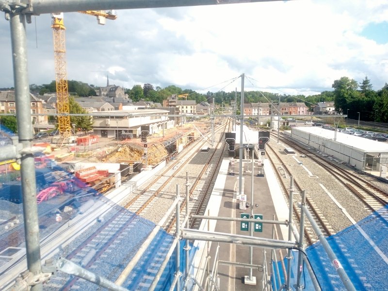 Hieronder twee foto's van de werken in Ciney: de eerste in de richting van Namen, de tweede in de richting van Libramont (met daarop links het stationsgebouw). Perronsporen 3, 4 en 5 zijn in gebruik; de sporen 1 en 2 moeten nog heraangelegd worden. Enkel het perron tussen de sporen 4 en 5 is bereikbaar via de nieuwe tunnel, maar die is enkel toegankelijk vanaf de achterzijde van het station; eerst moet je via de oude tunnel van de voor- naar de achterzijde. De route is niet bewegwijzerd, de reiziger moet het zelf maar uitzoeken. Om op het perron van spoor 3 te komen moet je dan nog via een hoge, metalen voetbrug. Weinig klantvriendelijk allemaal... De foto's zijn vanaf die voetbrug gemaakt.