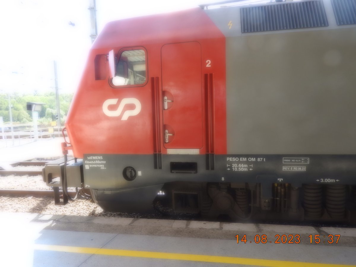 2/ wat wij een IC zouden noemen, gesleepte treinen, ik denk niet dat ik al kopstuurstandrijtuigen gezien heb dus ze moeten ze blijkbaar omzetten, keer op keer. De wagons zijn uitvoerig gemarkeerd, met aanduiding van fietsplaatsen, rolstoeltoegang, WiFi, airco, noem maar op. 3/ plaatselijke treinen worden verzorgd met dieselstelletjes, meestal van drie. Die zijn er gruwelijk afgeleefd uit, de Belgische klassiekjes hebben er niks aan. ik begrijp dat ze in meerdere reeksen bestaan, eveneens net als de Belgische klassiekjes. Volgens wikipedia heeft de CP nog wel andere reeksen dieselstelletjes maar die heb ik nog niet tegengekomen. Een dezer ga ik wel eens gaan rondhangen in het station - en het aanpalend spoormuseum - van Entroncamento, daar krijg ik allicht meer te zien. Zoals in elk Portugees station dat ik al bezocht zijn er uitvoerige openbare toiletten, gratis, helaas niet altijd even proper. Ook al lopen er de hele tijd poetsploegen af en aan. Op de perrons staan automaten voor koffie en snuisterijen, maar er is ook een zeer aanvaardbare bar, waar ik welgeteld 1,20 euro betaalde voor een fris flesje van 25 cl fluitjesbier.