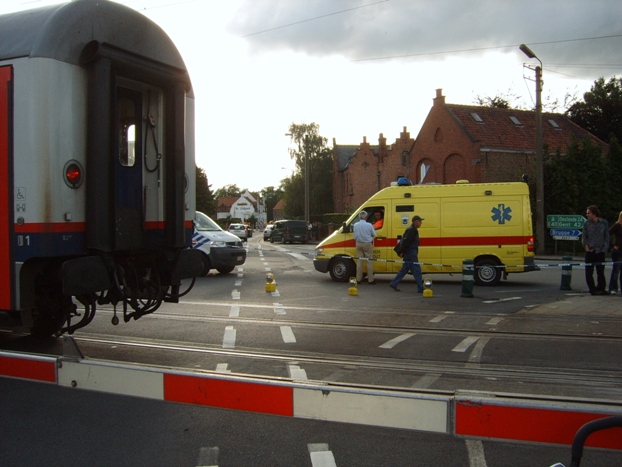 de RE 7001 (HLE 2749 + 9 I6'en) (Oostende nr. Kortrijk) ramde op OW21 een auto die zich kort voordien vast reed.