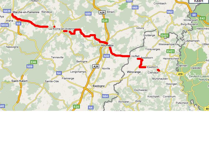 En hier is het dan, het langverwachte DEEL 4! :P Vandaag belooft de op één na zwaarste dag (= dag 2) van het traject te worden. Er moeten maar 82 km afgelegd worden, de kortste etappe, maar door het vele klimwerk telt iedere kilometer dubbel. Vandaag bereiken we ook het hoogste punt van ons traject, op het Ardens plateau, op enkele kilometers van de Baraque Fraiture (+652m). De gemiddelde snelheid zakt verder weg tot 15 km/u. Uitschieter die dag is 52,0 km/u! Hierbij nog even de dienstregeling van vandaag: